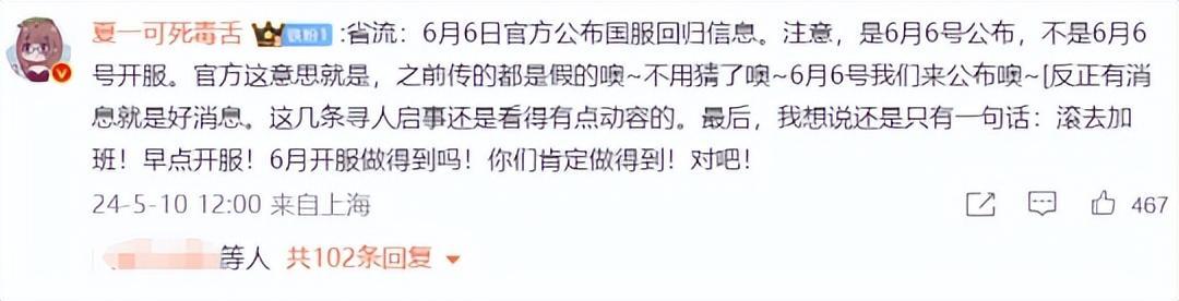 知名魔獸博主夏一可留言劃重點稱,6月6日官方會公佈國服的迴歸信息,而不是意味着6月6日就會開國服。