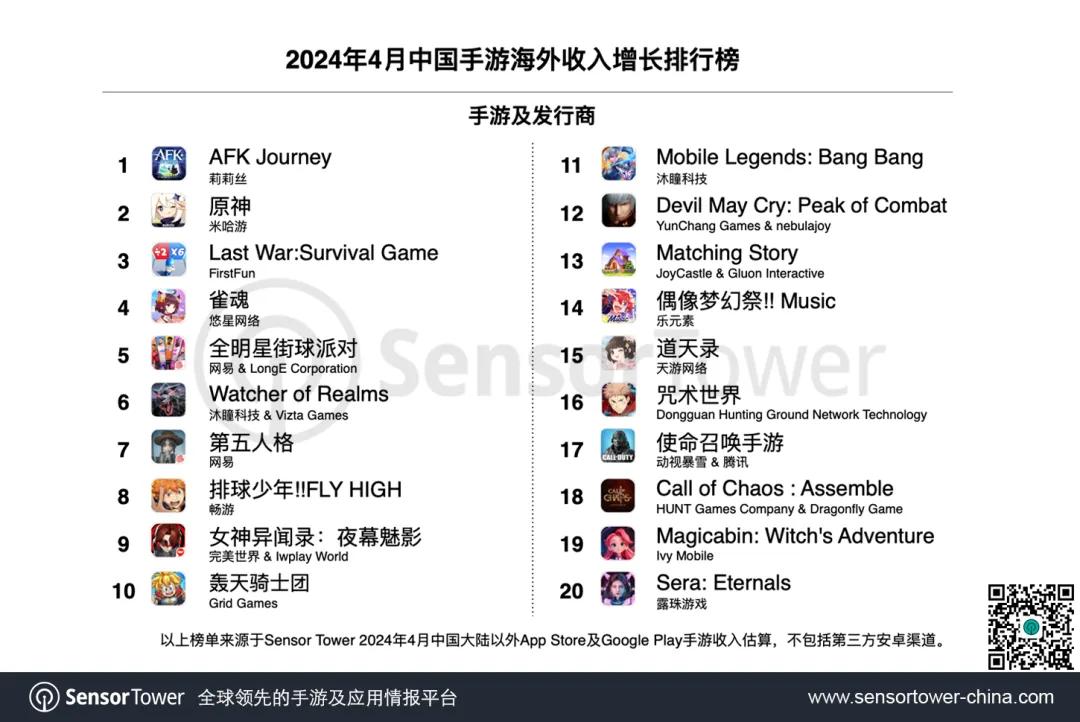 同時Sensor Tower數據顯示,AFK2登頂了4月的海外收入增長榜,衝進海外收入榜Top10,超越《萬國覺醒》成爲莉莉絲當前收入最高的遊戲。
