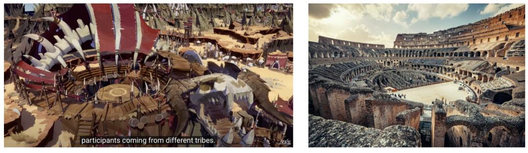 與此前AFK陣營設計僅只是屬性剋制關係不同,AFK2這次明顯有意豐富各個陣營的設定與故事,會用更偏IP內容的邏輯去做。像第一個賽季「殘陽下的戰歌」,就是圍繞蠻血部落展開,光是沙漠就參考青海貴德的丹霞地貌、羅馬鬥獸場、美國科羅拉多大峽谷等多種地形風貌,以實現多層次、更具沉浸感的地圖設計。