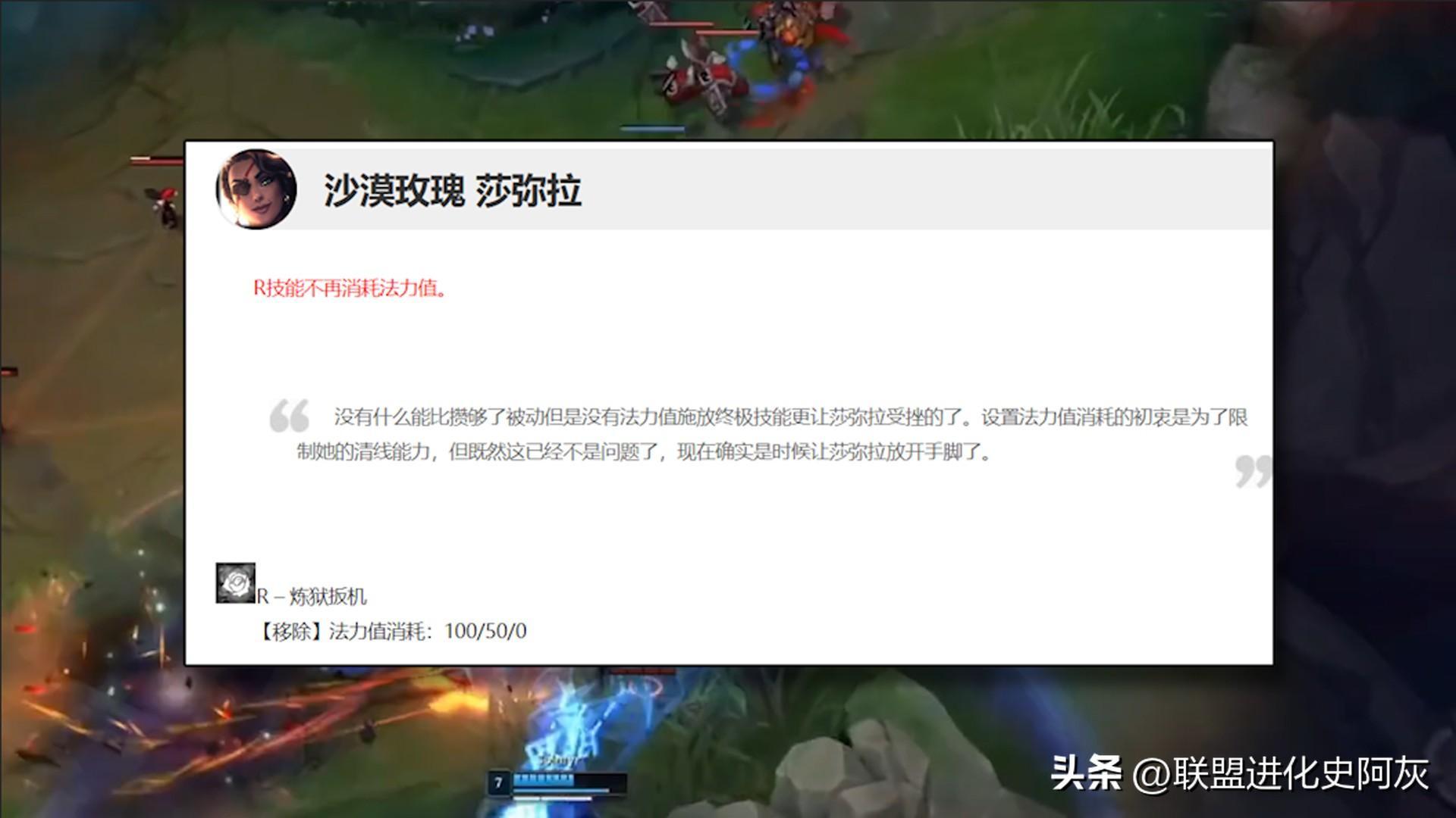 除了莎彌拉之外,還有兩個英雄是逐級遞減的,一個是天使,老版天使大招不耗藍(4.2版本起),新版增加了傷害,剛重做那會全等級都是100藍耗,後來設計師覺得這樣不符合登神的設定,才改成了每次飛昇藍耗降低。