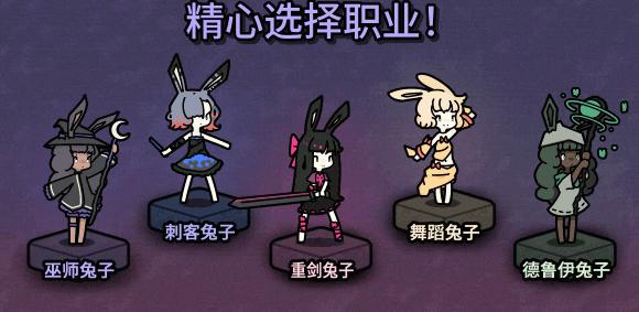 進入遊戲,玩家需要選擇一隻兔兔作爲操作對象,每隻兔子背後都代表着不同的職業,比如巫師兔擁有可以強化輸出的法陣,重劍兔友有免疫傷害的無敵,德魯伊兔可以生成召喚物……
