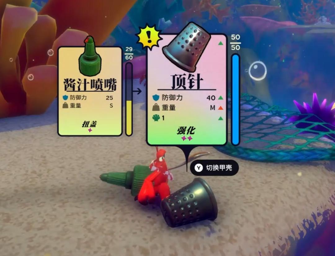 除了破殼之外,遊戲還能怎麼自然地引導玩家多嘗試呢?蟹Bro的做法,是給所有的殼都設置了不同的屬性、種類和技能。比如塑料瓶蓋是一種輕甲,揹着它防禦力低,但是翻滾靈活,技能也是出手迅捷的上挑;相反地,像椰子殼、舊獎盃就是重甲,防禦力高但會降低靈活度。