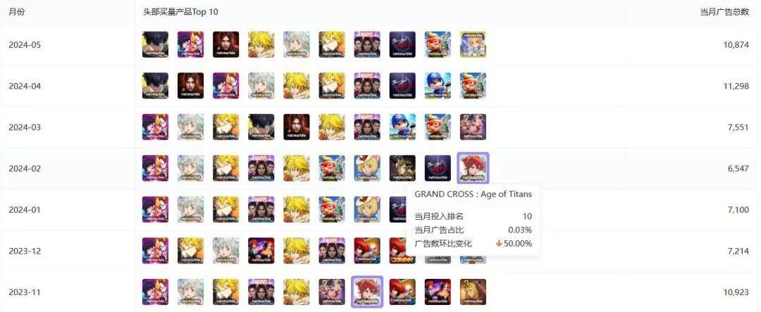 不過,脫離 IP 之後,產品表現就有些乏力了。比如去年推出的“二次元+SLG”手遊《Grand Cross:Age of Titans》就表現平平。從各產品投放佔比變化來看,也可以發現 Netmarble 在營銷投放上也“放棄”了這款產品,主要預算還是放在《七騎士》《神之塔》等 IP 改編作上。