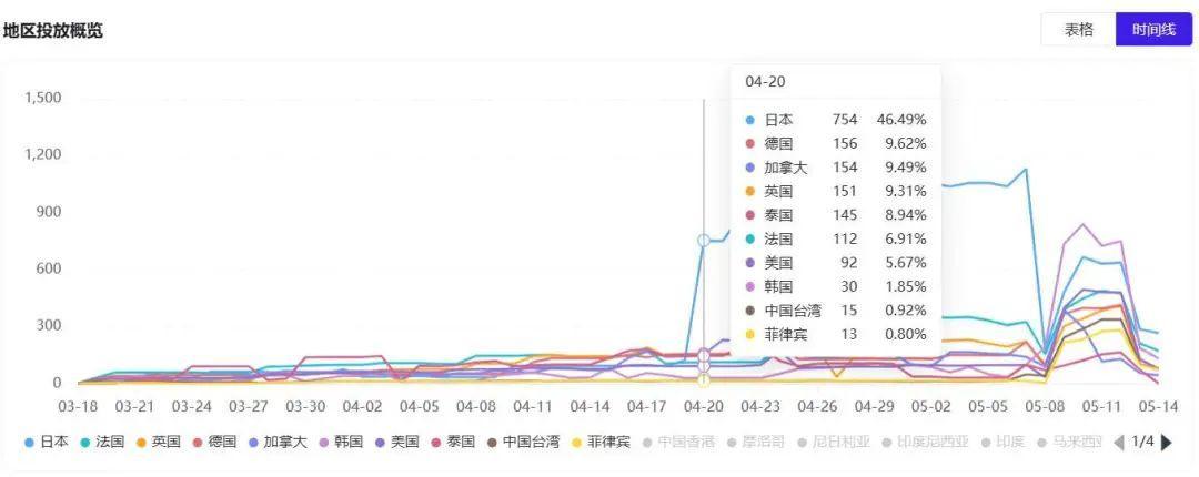 在 4 月 20 日之前,遊戲投放呈現出分散的趨勢,日韓、歐洲、北美、東南亞、港澳臺均有廣告投放,且佔比相差不大,猜測是通過買量的方式快速驗證遊戲風格與目標市場的適配度,同時也爲後續全球化發行鋪墊用戶認知基礎。