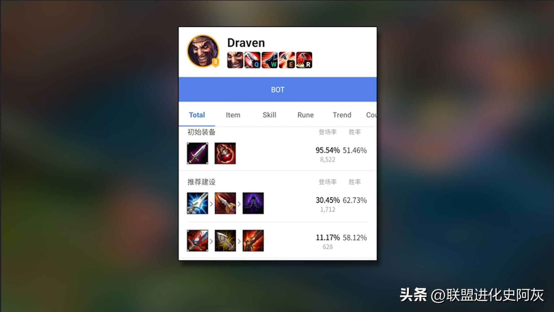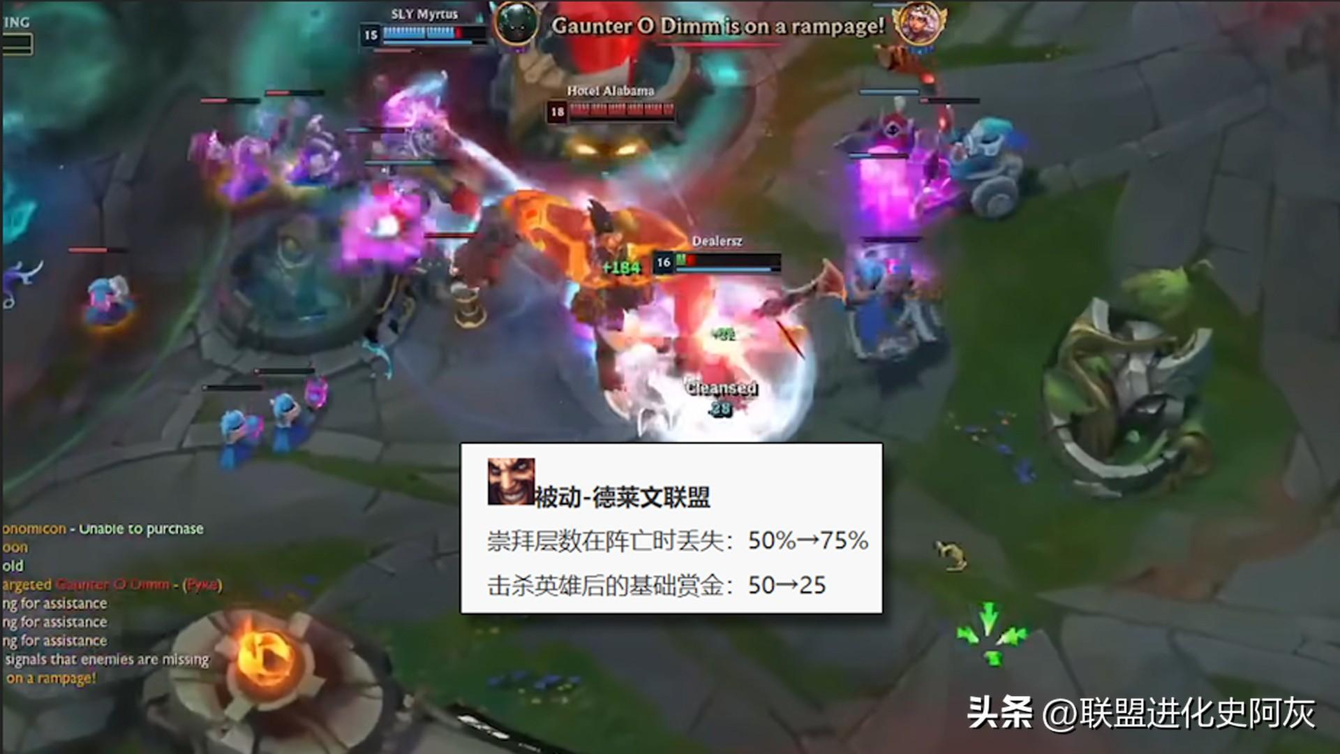 神話版本就更秀了,暴擊、穿甲裝全出了一遍,甚至還有無神話流,各種排列組合,設計師削都削不過來,並且還有一個非常誇張的事情,14.8版本回調了此前對Q技能傷害削弱之後,新版德萊文上線11年來就僅有過這一次削弱(5.22那次是加強,但負優化),加強則有十幾次!(只展示部分)妥妥的數值怪啊!難怪現在路人局都鯊瘋了。