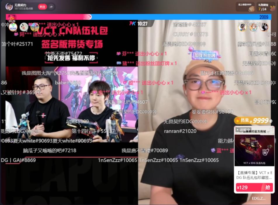 直播當天,儘管隊內王牌明星選手康康(ZmjjKK)沒辦法來到現場,但依舊通過連線的方式參與了直播,甚至當場立下FLAG:賣貨達標全隊染頭,主打一個“來啊,命令我啊”的狂。還值得一提的是,EDG這次派出的代表並非選手,而是兩位管理層人員——俱樂部運營負責人老潘,以及賽訓負責人阿布,可以看出戰隊自己的重視程度。