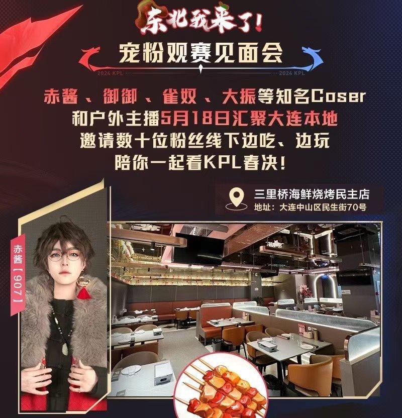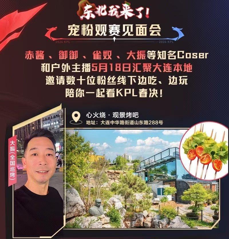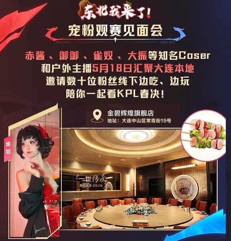 除桑傑、騷白、辣辣、天賜等快手自家主播鎮場的決賽高能觀賽團以外,官方還和大連本地三家飯店合作開展線下觀賽活動,邀請了數十位粉絲到店,和coser、戶外主播一起邊喫邊看KPL春決。