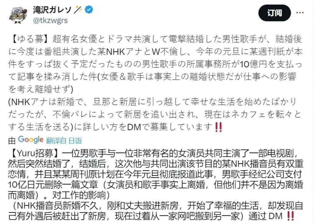 昨天晚上,有人曝料與超有名女演員因戲結緣並閃婚的男性歌手,結婚後與某位NHK女主播在共演節目期間出軌,該醜聞原本該被爆料出來但被當事人以10億日元的封口費壓下了。