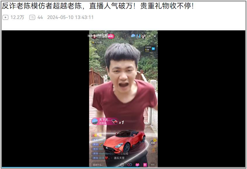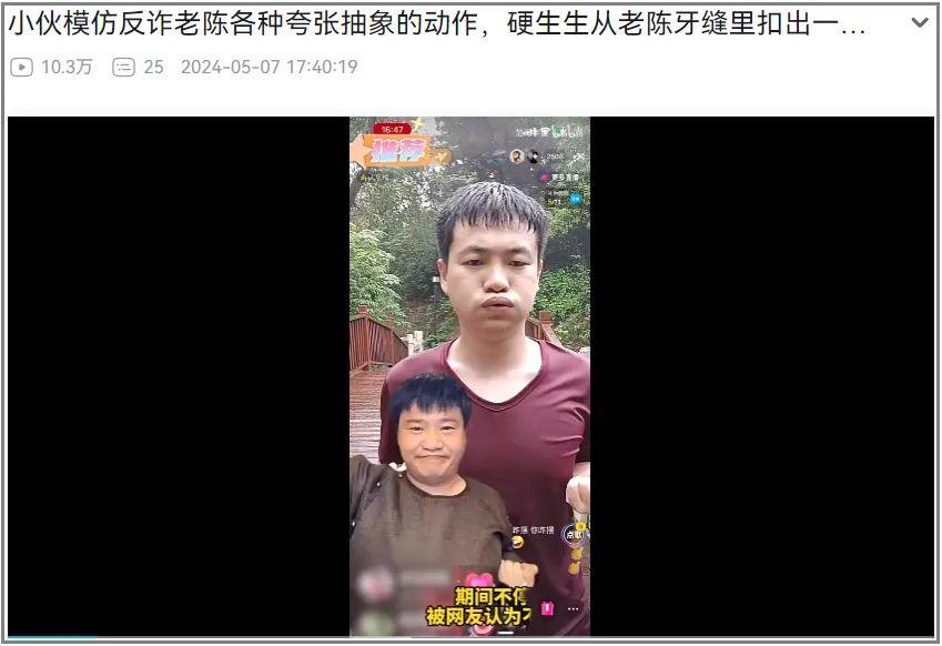 而2.0版本的另一大特徵,正如前文記載,爲倒反天罡。只見短短几天內,這位“反詐小陳”的熱度已經暴殺了原型機“反詐老陳”。以至於老陳反而主動邀請小陳連麥反詐,我給大家翻譯一下他們的對話:喫水別忘挖井人,過去你叫我老陳,現在我喊你聲陳哥,咱兩組團掙達不溜你說行不行。