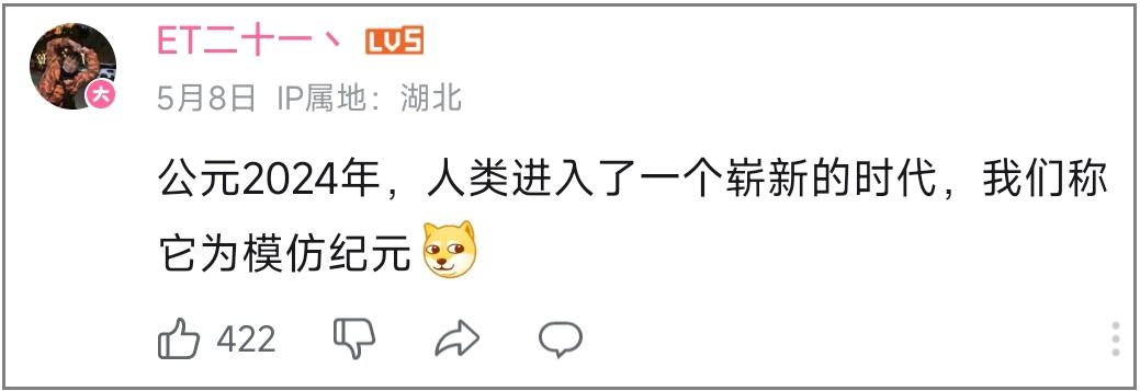 和內測版本相比,大仿生時代的重大更新,是萬物皆可模仿,不侷限於娛樂體育、歷史政治、遊戲二次元等任何圈層。“上流”和“下流”間的壁壘也被打穿,畢竟再怎麼草根的網紅,也是萬分之一概率的幸運兒。於是,模仿草根網紅,成了剩下萬分之9999的人的流量密碼。