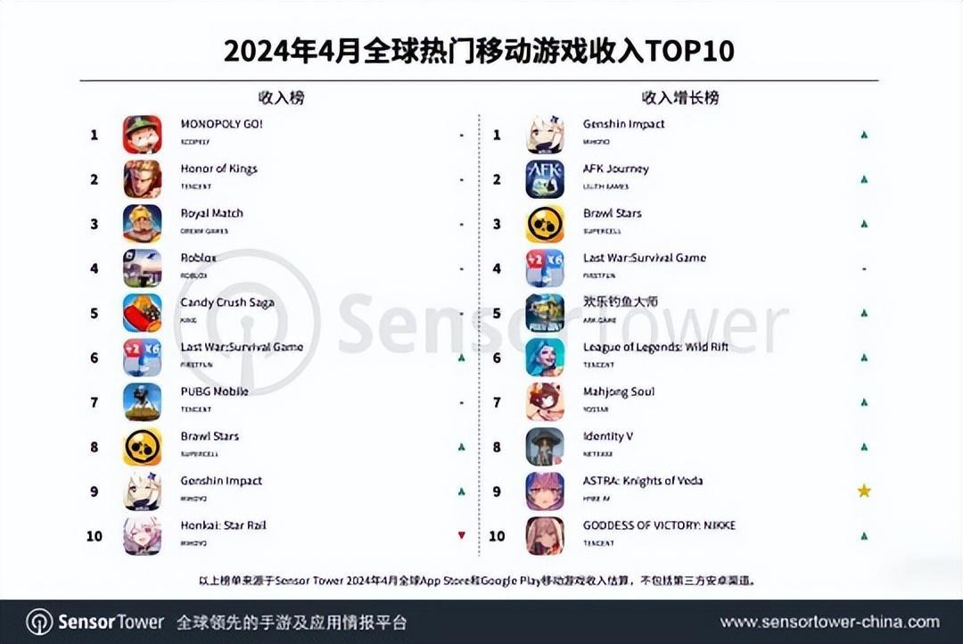 收入榜:前10名分別是《MONOPOLY GO!》、《王者榮耀》、《皇室戰爭》、《Roblox》、《糖果粉碎傳奇》、《最後的戰爭:生存遊戲》、《和平精英》、《荒野亂鬥》、《原神》、《崩壞:星穹鐵道》