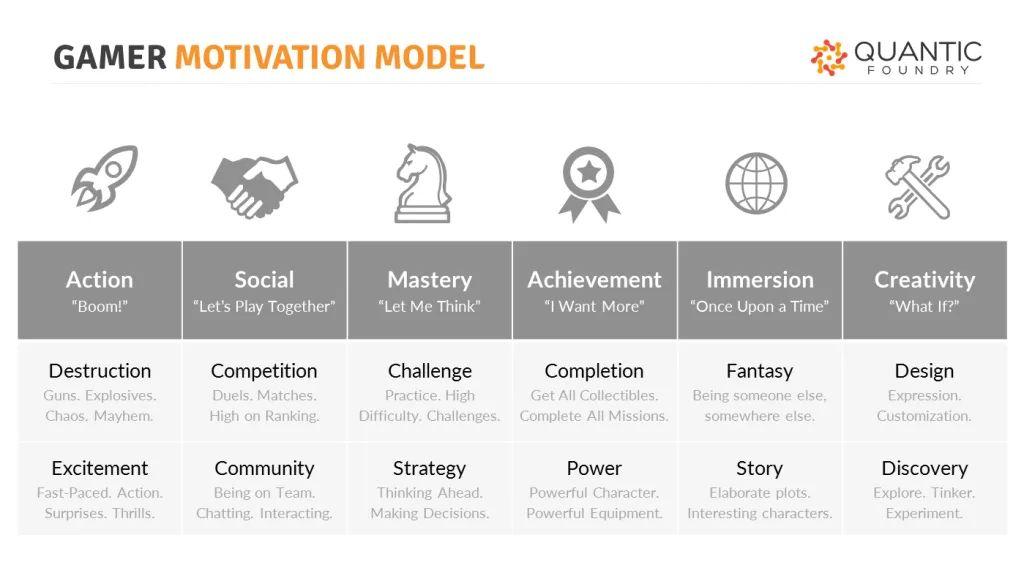 Quantic Foundry是一家位於美國的海外遊戲市場研究公司。該公司將玩家玩遊戲的動機概括爲十二類,分別是破壞、興奮、競爭、社交、挑戰、策略、完成、力量、幻想、故事、設計和探索。