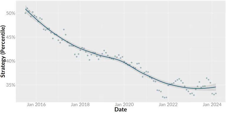 通過在2015年6月至2024年4月期間收集的157萬份數據,他們發現,大部分遊戲動機的吸引力一直維持在相對穩定的水平,即使有變化也非常輕微。然而,在過去九年中,“策略”的吸引力大幅下降,其下降幅度甚至超過了第二大變化的兩倍。