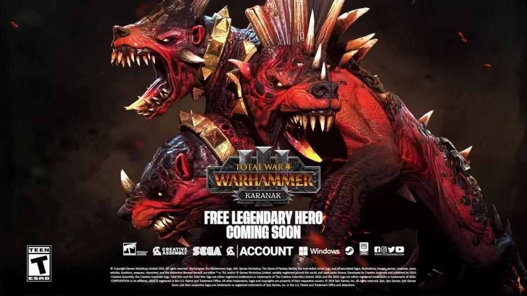 《全面戰爭:戰錘3》發佈即將登陸的免費英雄“恐虐地獄三頭犬”Karanak預告。