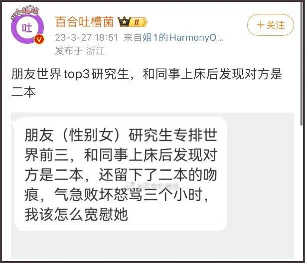 起源可能要追溯到去年3月,有網友在微博某女酮Bot投稿,說自己有一個研究生的女性朋友,專業排世界TOP3,和女同事上了以後發現對方是二本,還留下了二本的吻痕,氣急敗壞怒罵三個小時。