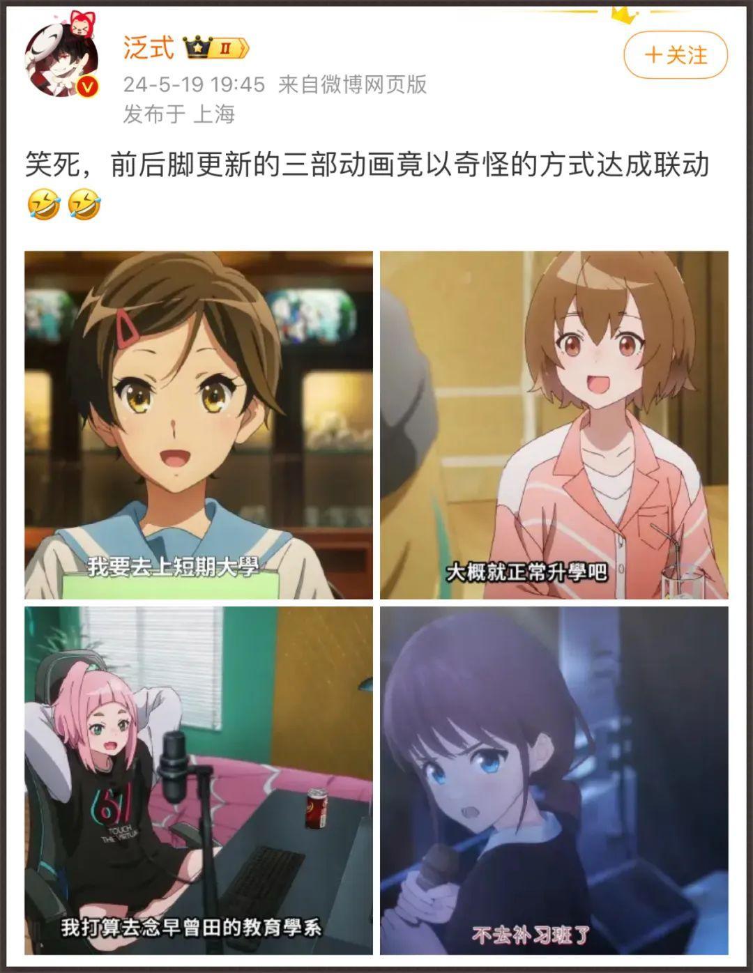 起因是前幾天我看到泛式吐槽,今年4月新番動畫以奇怪的方式達成了聯動——少女們爲未來的志願陷入煩惱。同一周更新的不同動畫裏,有的人準備上短期大學,有的人打算正常升學,有的人輟學自考,結果連補習班都不想上了……