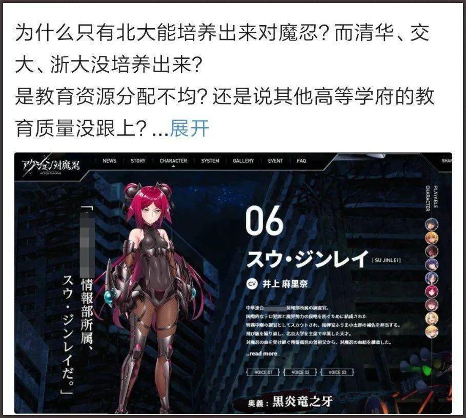 比方說《對魔忍》系列出過一箇中華系角色,設定是畢業於北京大學的天才,曾經當過學生會主席,之前在國內“學歷廚”圈子挺出圈的。
