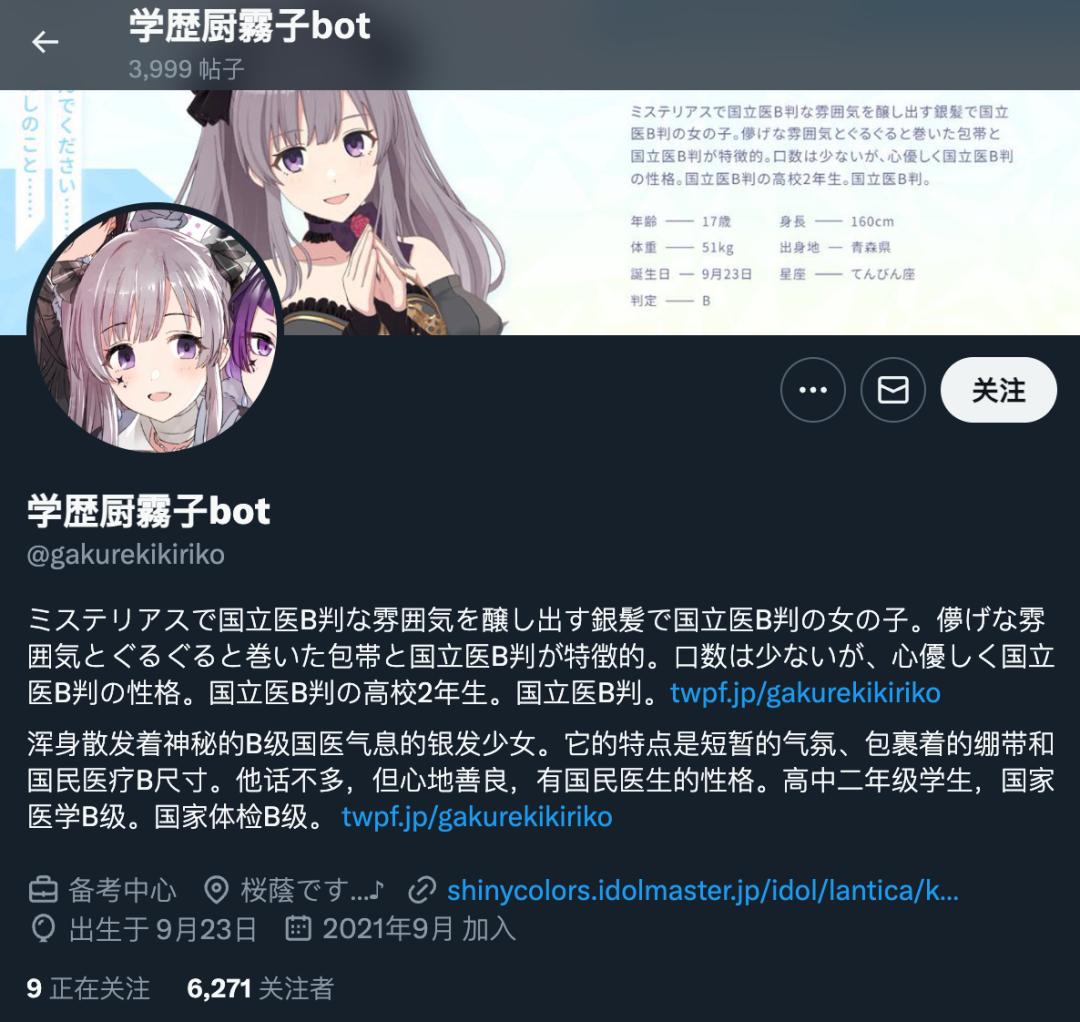 也有更魔怔的。比如推特上有一個「學歴廚霧子Bot」,專門搞學歷相關的吐槽,非常有日本人特色的發癲Bot。