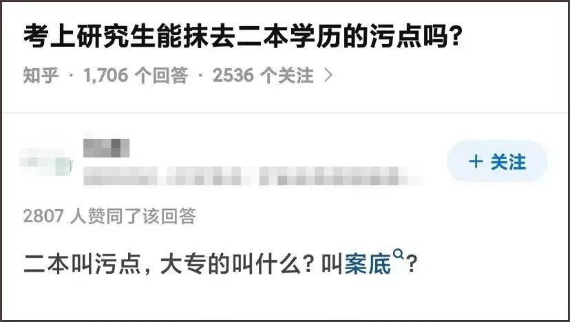 觀感有點類似一個知乎段子,有人問“考上研究生能不能抹去二本學歷的污點?”,然後被人反問,“那麼上大專的叫什麼?叫案底?”