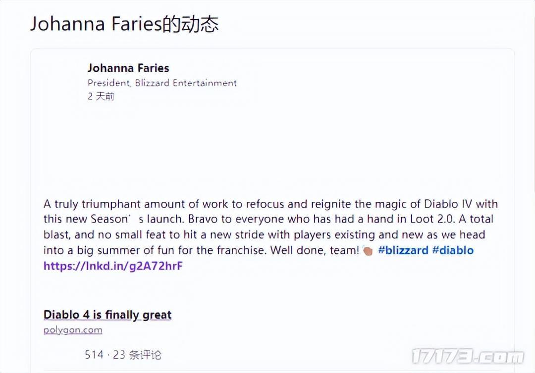 日前,暴雪娛樂總裁約翰娜·法里斯也在領英發文表彰了《暗黑破壞神4》背後的團隊:“隨着新賽季的推出,我們付出了巨大的努力,重新聚焦並點燃了《暗黑破壞神4》的魔力,向所有人致敬。幹得好。”