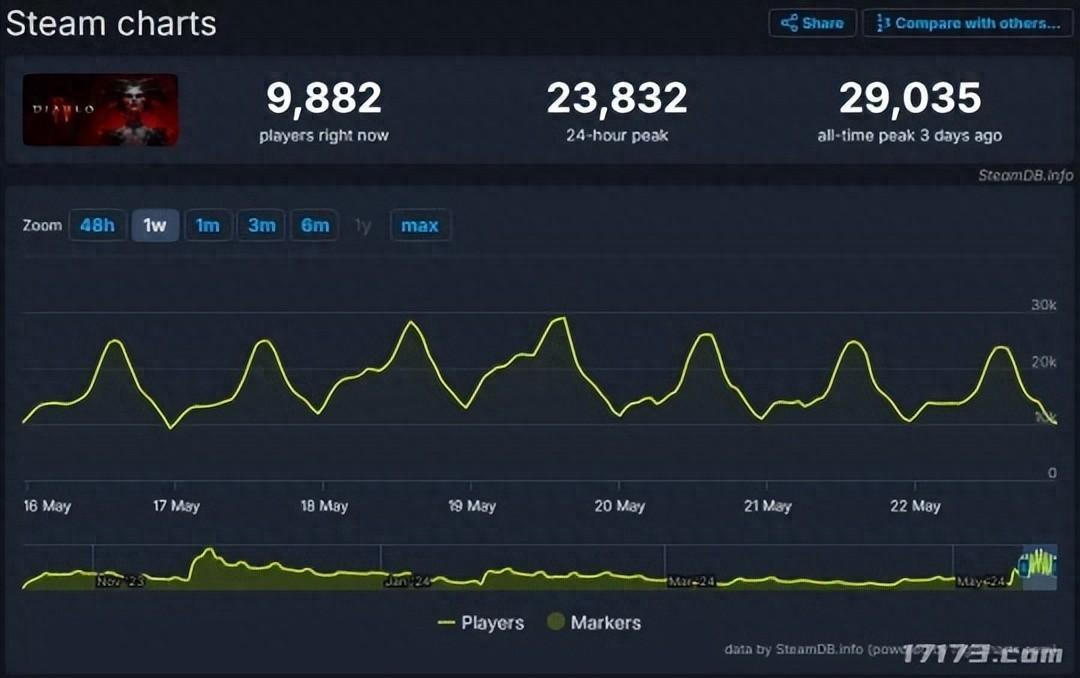《暗黑破壞神4》第四賽季“尋寶重生”推出以來,獲得大量玩家好評,許多人也迴歸遊戲。現在據Steamdb數據顯示,《暗黑4》在Steam上同時在線峯值人數達到29035人,創造新紀錄。