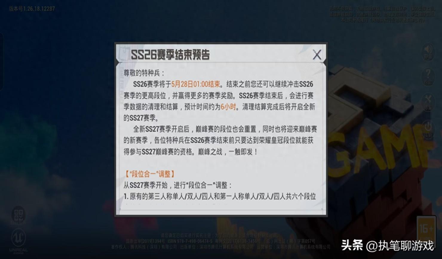 歡迎諸位小夥伴們來到天哥開講的《和平精英》“精英小課堂”~由於SS26賽季開始“減負”,縮減了大量的時間,所以之後的賽季交替將會早於大版本更新。如今伴隨着時間推移,SS26賽季已經正式公佈了結束預告。