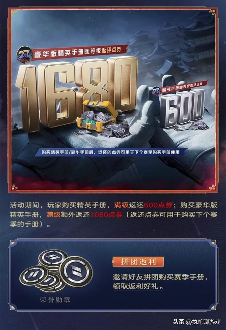 早期的《和平精英》賽季手冊返還點券,僅有600而已,但是自從SS26之後,光子就進行了調整,精英手冊滿級返還600點券,豪華手冊滿級則可以返還1680點券,而且在遊戲中還帶來了拼T返利等方式,相比以往的手冊來講,還是挺良心的。