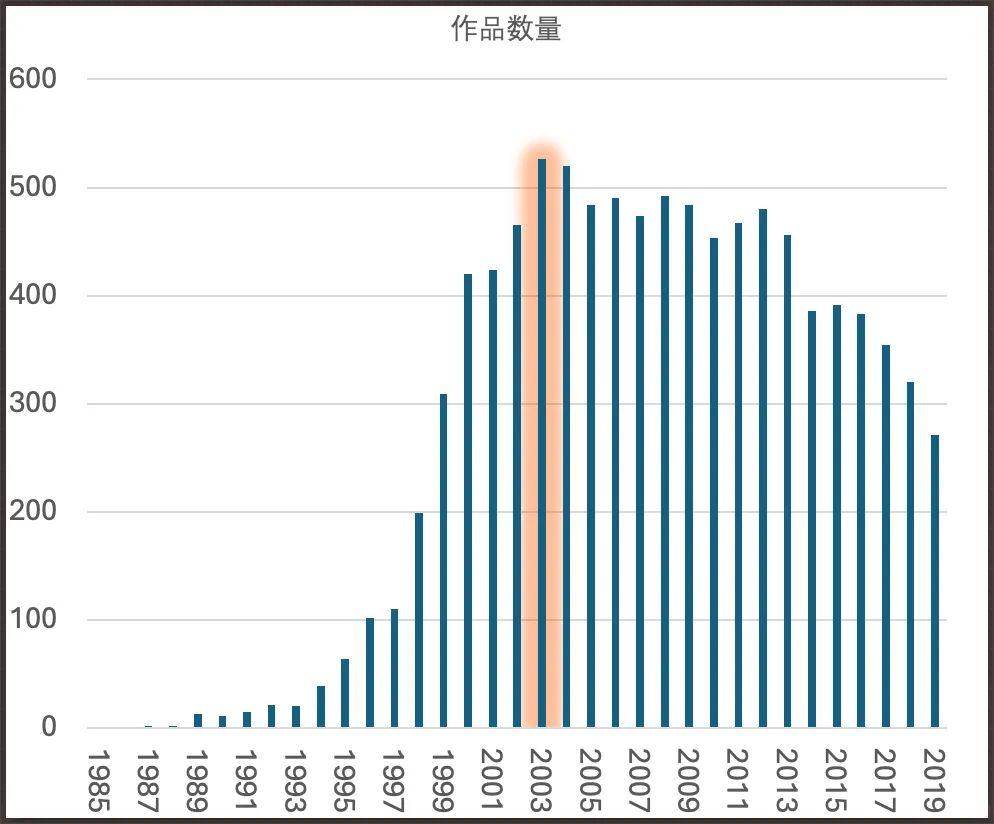 我這裏拉了一份批評空間(日本黃油圈的“豆瓣”)有記錄的作品數量,可以看到作品井噴的年份基本覆蓋PC-98的“DOS系統”到 Windows XP系統的生命週期。