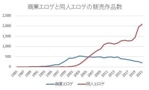 (藍線是商業黃油販賣數,紅線是DLsite的同人黃油販賣數,出自DL論壇的愛好者統計)