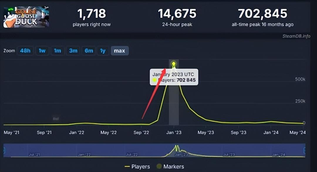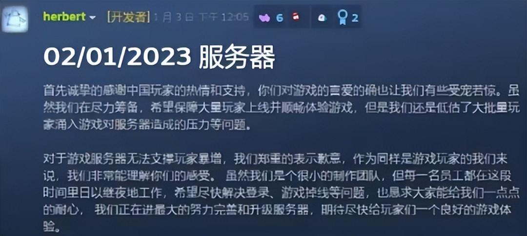 像前兩年的《鵝鴨殺》,發佈一年多無人問津。結果就因爲中國主播的直播,在線數飆升,巔峯時到了70萬。官方感激得不得了,社區公告直接置頂,對中國玩家一頓誇。