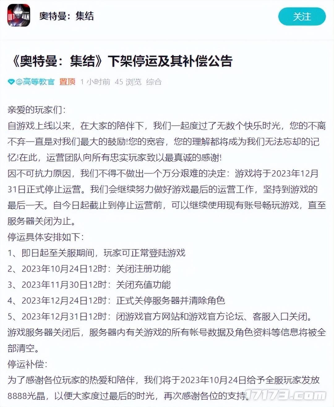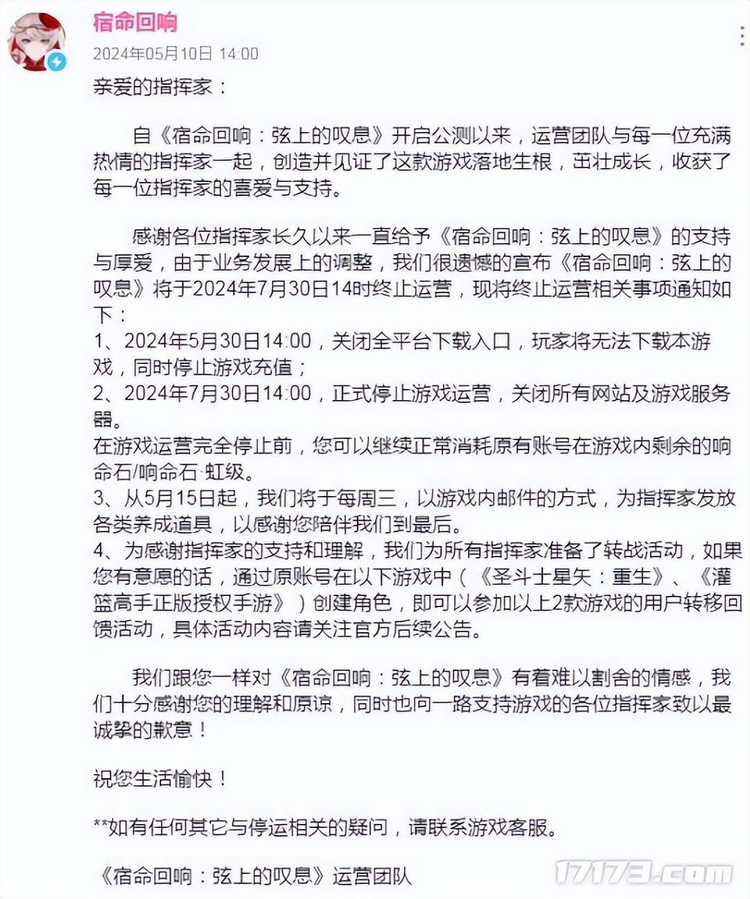 最終,在2023年10月,遊戲官方發佈公告宣佈,遊戲將在2023年12月31日正式停止運營。