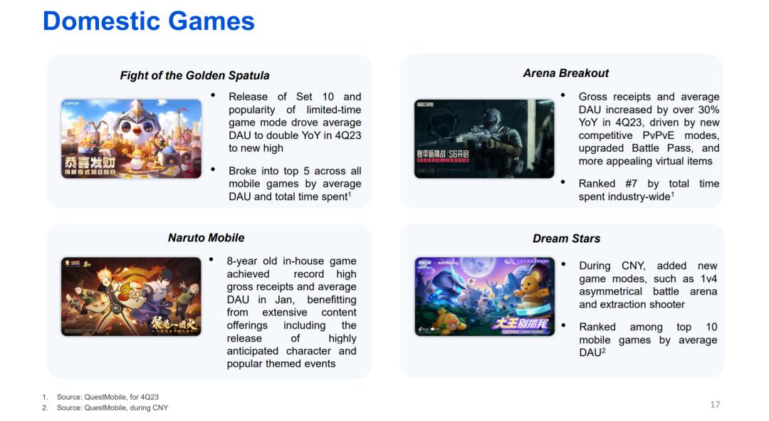 但如果以這點爲判斷依據,騰訊近年也並不缺爆款。騰訊2023年全年財報就表示,「年流水超40億元,且季度平均日活超500萬(手遊)/200萬(端遊)」的產品,從6款升至了8款。