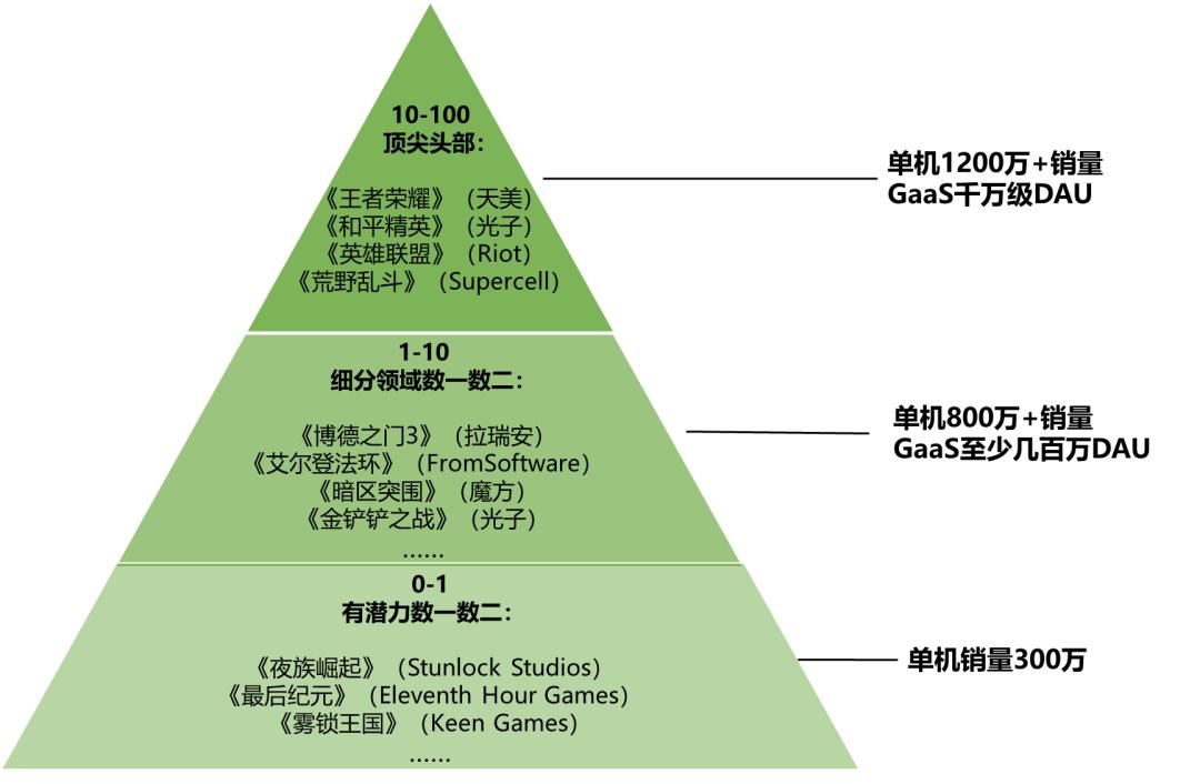從正面去看,它又成金字塔狀。最底層,是那些有潛力的初創團隊;中間則是在細分領域裏,做到了數一數二的團隊;再往上走,是處於行業頭部的頂尖工作室。