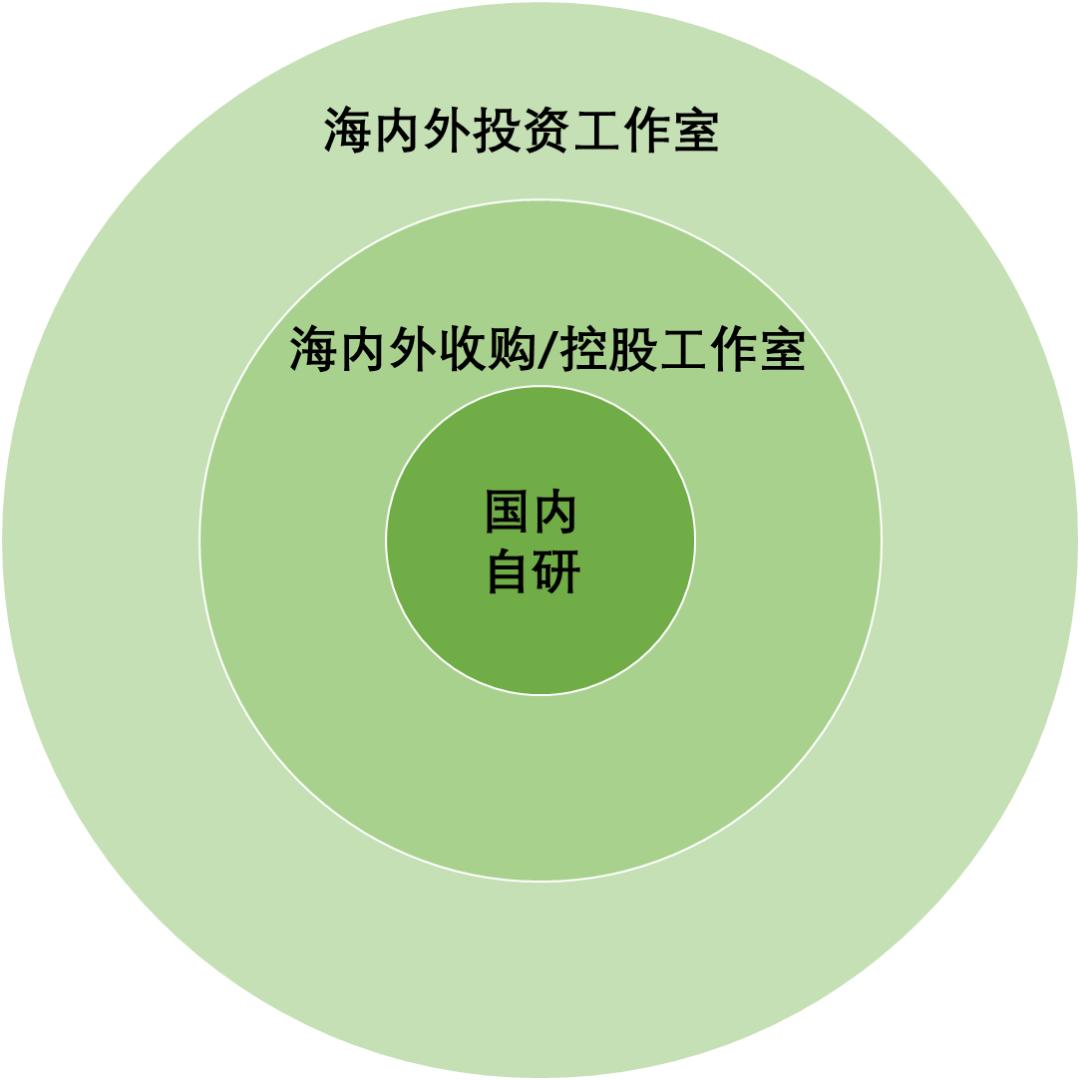 從俯視角去看,它是一個同心圓,從裏到外共有三層:國內自研,海內外收購/控股工作室,以及海內外投資工作室。這是通過團隊擴張形成的多點開花。