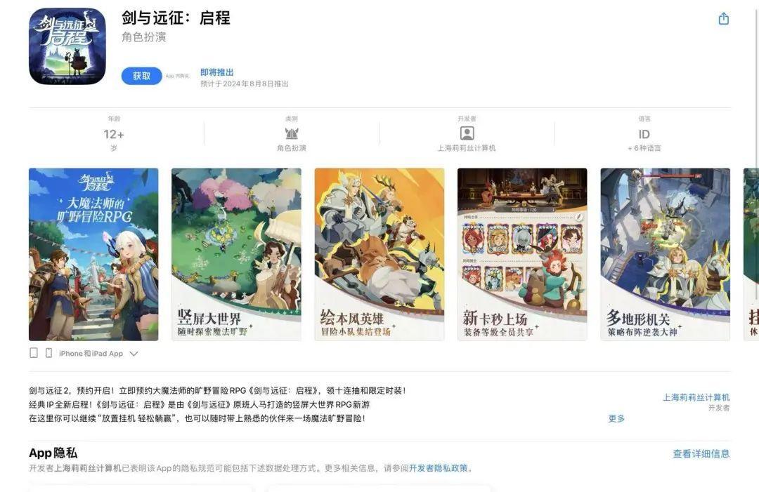 根據國區蘋果應用商店頁面今日更新顯示,《劍與遠征:啓程》預計於2024年8月8日上線國區。