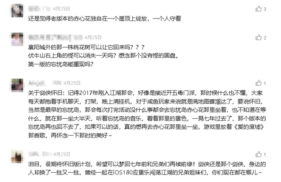 《劍手》的一些老玩家,就會懷念像忘憂島這樣的老場景,懷念和大家一起聽着BGM發呆,甚至是對一個小細節、一株桃花樹念念不忘。