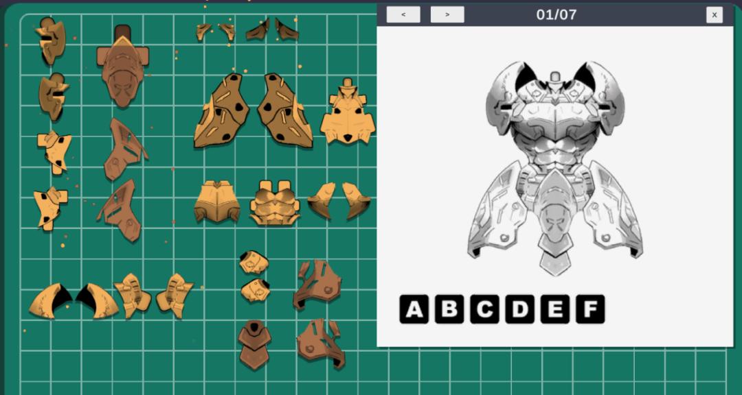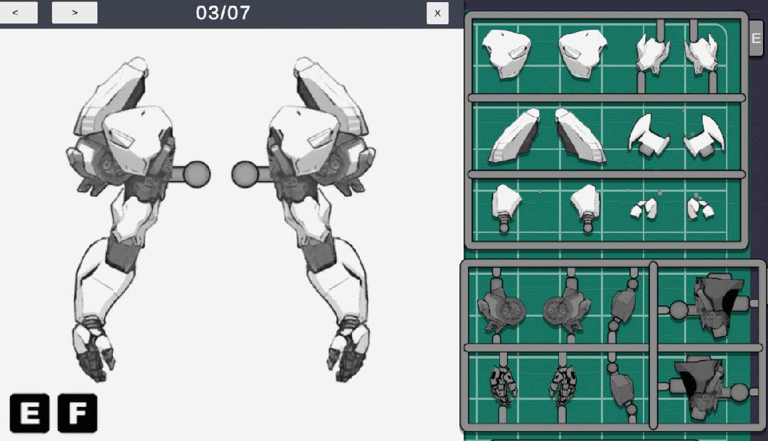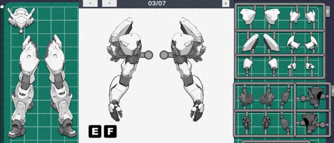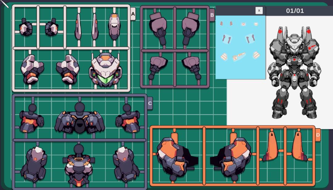 你將根據遊戲所給出的套件及圖示,用鉗子將一個個小零件剪下來,再將它們拼接在一起,組裝成一個個機甲模型。