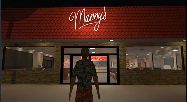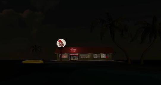 餓得絕望的布萊恩就這麼來到了夜晚,這時,小島上突然憑空出現了一家漢堡店,亮紅色的招牌上寫着它的名字——曼尼漢堡店。