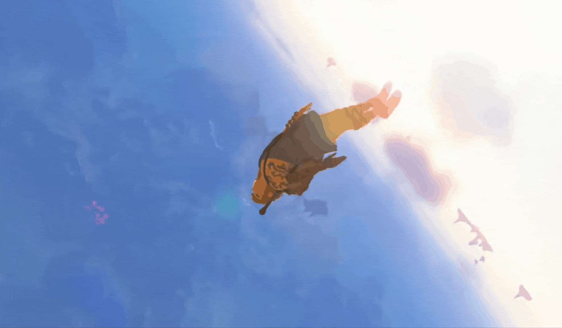 而在王國之淚中只需要直接往下跳即可,這是因爲自荒野之息開始開發組就貫徹一個所有場景都要無縫相接的理念。無論是從屋子裏開門出來還是從一個天空區域進入到地面區域,都不需要黑屏轉場。