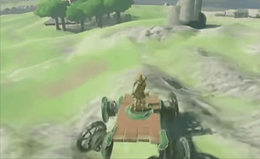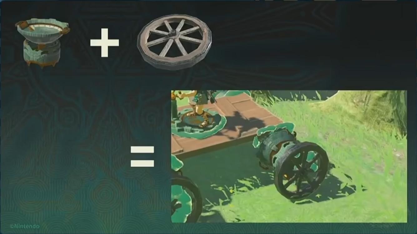 而在王國之淚中開發者選擇的方式是把其他元素都準備好,像是車輪、操縱桿、木板等,這樣玩家就可以自己去講這些東西組合起來創造出車輛。因爲開發者的目標之一是要創造一個可以根據玩家的自由創意發生各種事件的世界,他們認爲一個好的設計是無需專門開發去實現各種獨特事件的系統。