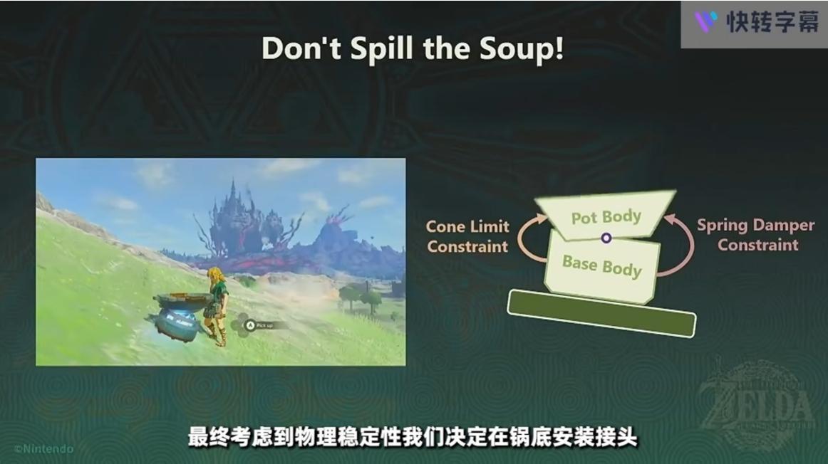 將大門改爲物理驅動之後就可以很好解決這個問題,之所以之前選擇非物理驅動是因爲其控制的實現速度更快。 在這整個王國之淚的世界中,開發組無一例外地將所有物體構建爲動態的剛體+剛體之間的約束組成,這樣就誕生了一個玩家可以自由發揮想象力而不會出現破綻的世界(提供一個有趣的系統框架,讓玩家自己去尋找各種解決方法)
