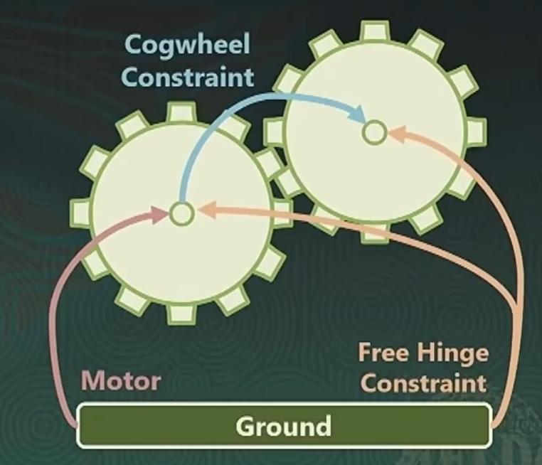開發者將兩個齒輪鏈接起來,然後通過約束連接來傳遞齒輪之間的速度,之後將其中一個齒輪改爲電機驅動。這樣一來所有的遊戲中計算都是基於物理規則,問題就解決了。