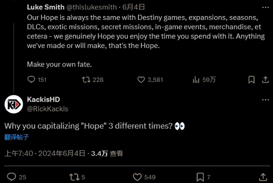 Luke Smith在推特上談論了《命運2:終焉之形》這一重大資料片,這是《命運》系列超過十年故事的終章。然而,他推文中反覆提及的"Hope"一詞,且每次都特別使用大寫首字母,這不禁讓人聯想到這是否是一個精心設計的暗示,意味着《命運3》有望上線了?