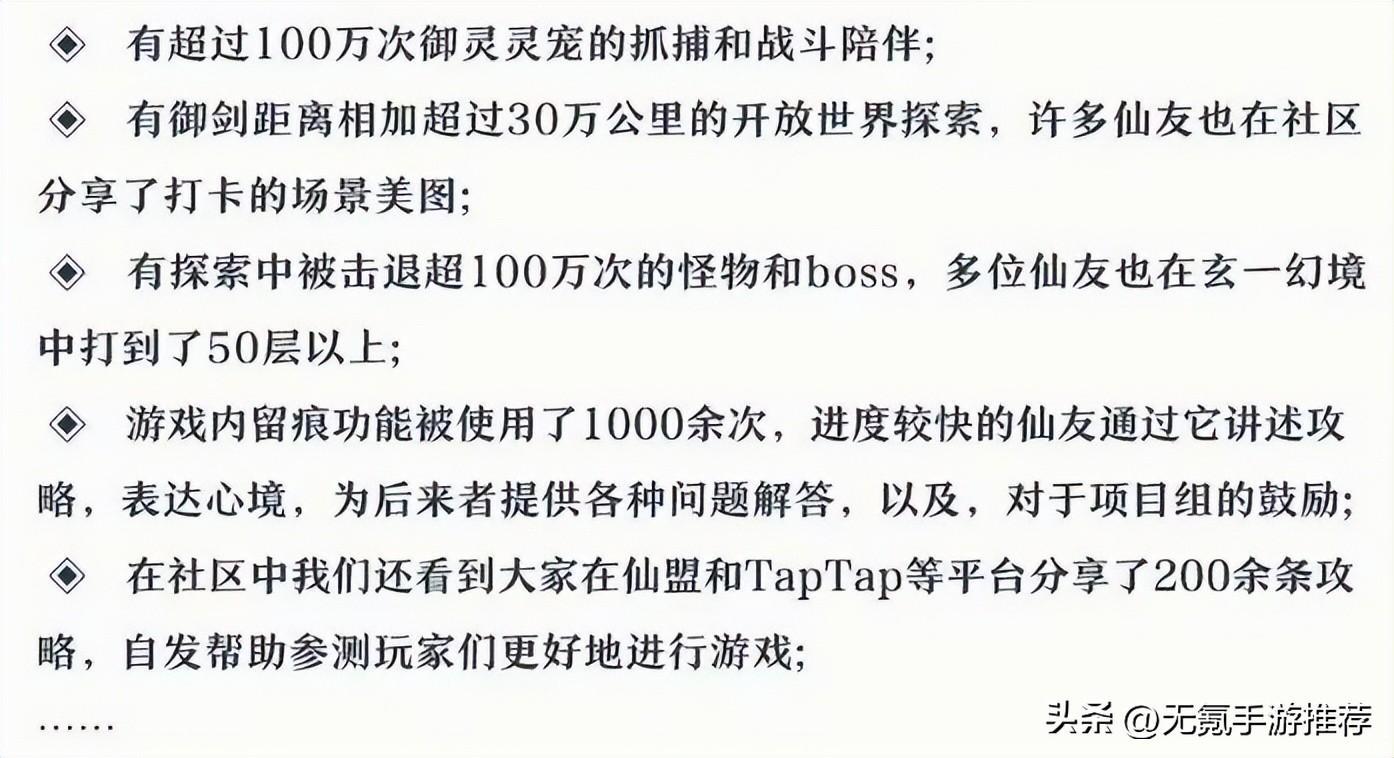 玩家們除了在遊戲中盡興體驗遊玩外,在網上也沒有閒着,官方數據顯示不少玩家通過“留痕”功能和社區分享的方式,留下了不少攻略和解答來幫助新仙友們。