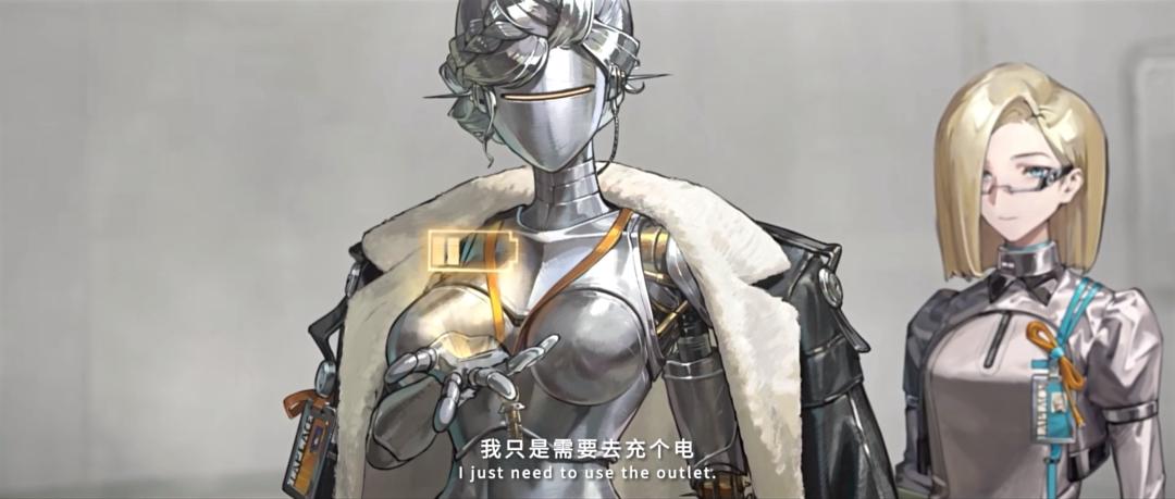 不過在立繪當中,她的身體後面還是吊着電線,關節連接處也裸露出機芯和電路;在展示界面,偶爾她還會炫耀自己的機械手臂……這又重新強調了她的非人化和科技感,也和她人性的部分反覆拉扯。
