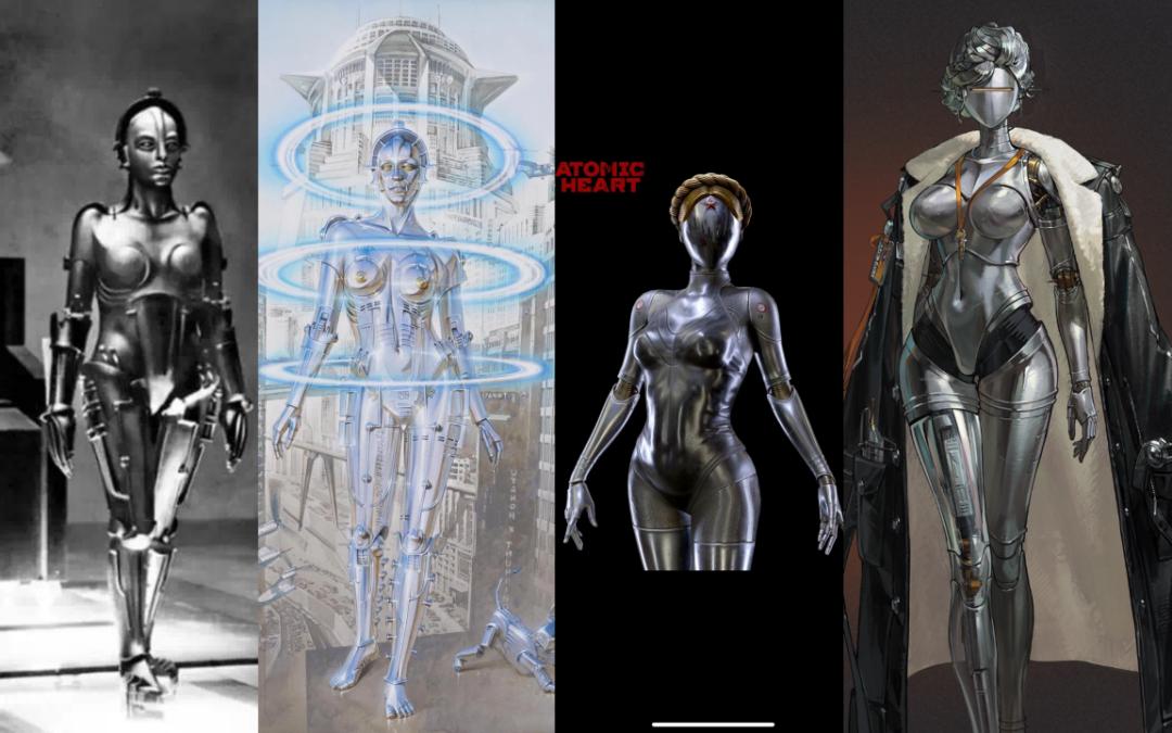早在1927年的電影《大都會》中就有出現機械姬的形象(下圖左1):金屬的光澤、硬度和冰冷的觸感,使其成爲科技進步的化身;空山基的sexy robot(左2),使得女性身體與金屬形成反差,通過非人化留出了審美距離,也減輕了觀看的道德負擔;《原子之心》當中,結合了藝術和科技的雙生舞伶(左3)則更不必說了。