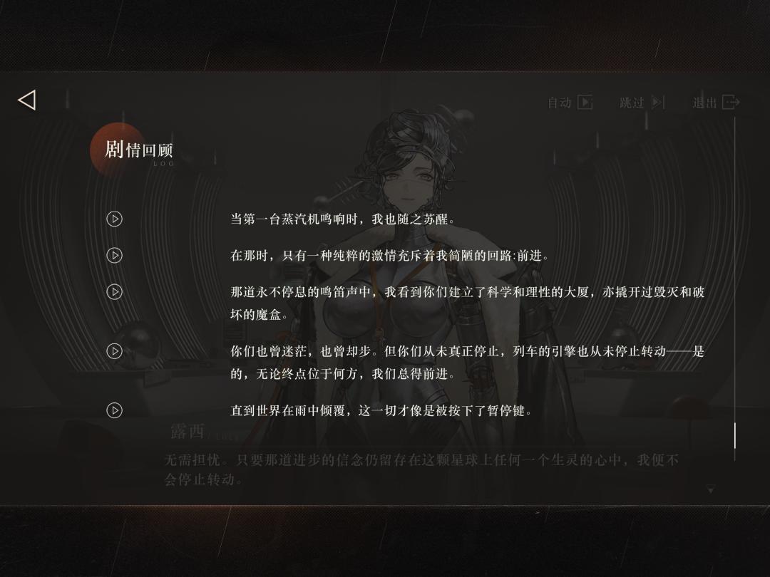 說回露西。角色劇情會告訴你,這位機器人是人類科技進步的見證人,見證了從蒸汽機、內燃機再到現代能源的變遷,也見證了人類如何一點點接近天空。某種意義上,她是基金會的代表,是追求進步的精神化身。而在這一過程中,她展現出了人類科技發展史上最突出的議題——工具理性與價值理性的衝突。