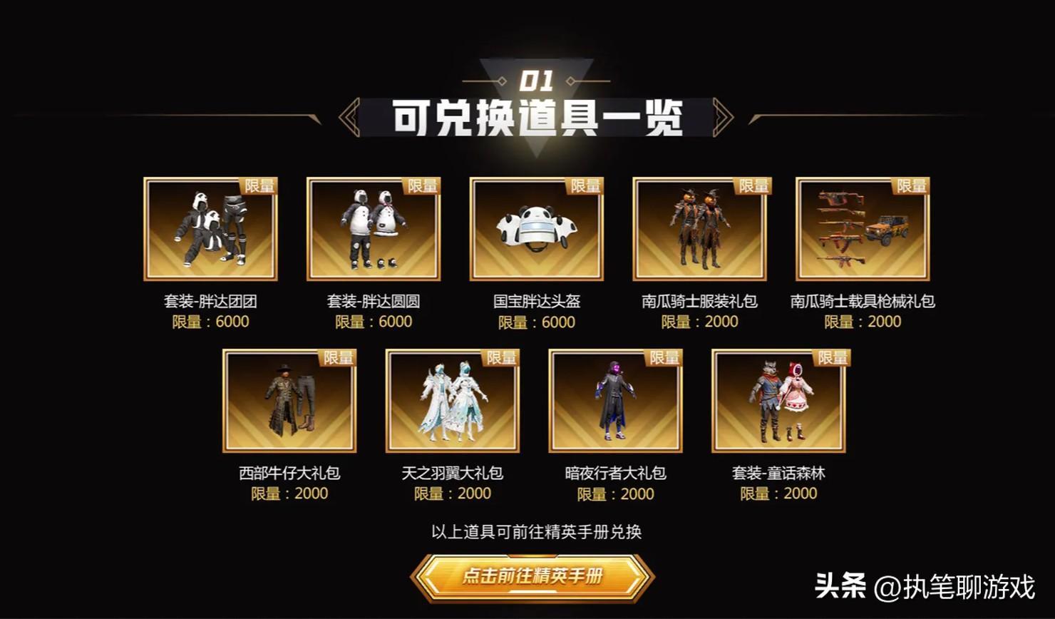 如圖所示,精英手冊限量版經典返場當中,一共出現了3個套裝,分別是胖達團團、胖達圓圓、童話森林,其中的團團、圓圓各有6000套,童話森林是2000套;5個達裏阿伯分別是南瓜騎士服裝、南瓜騎士載具、西部牛仔、天之羽翼、暗夜行者,每種都是2000套。