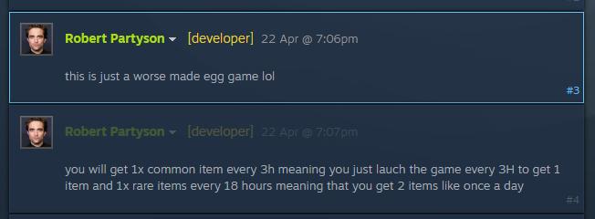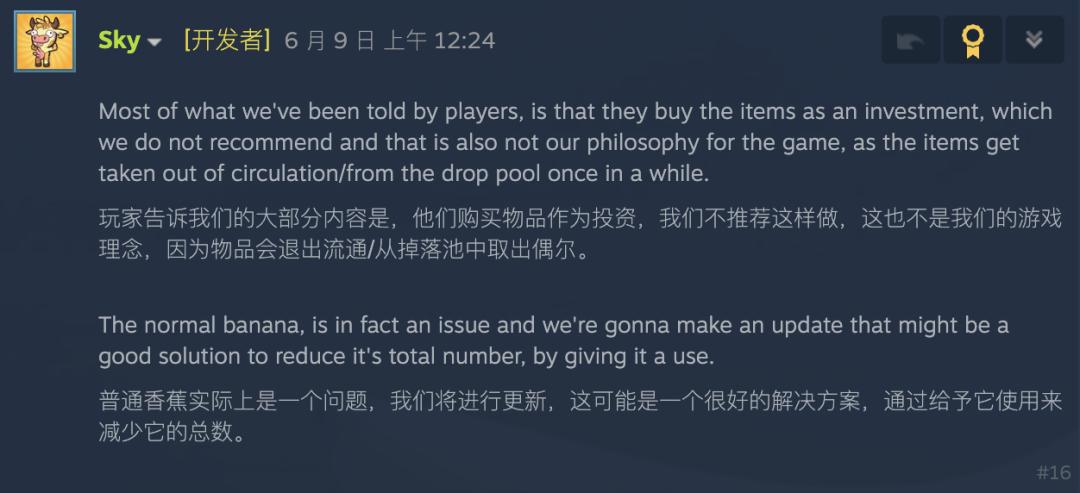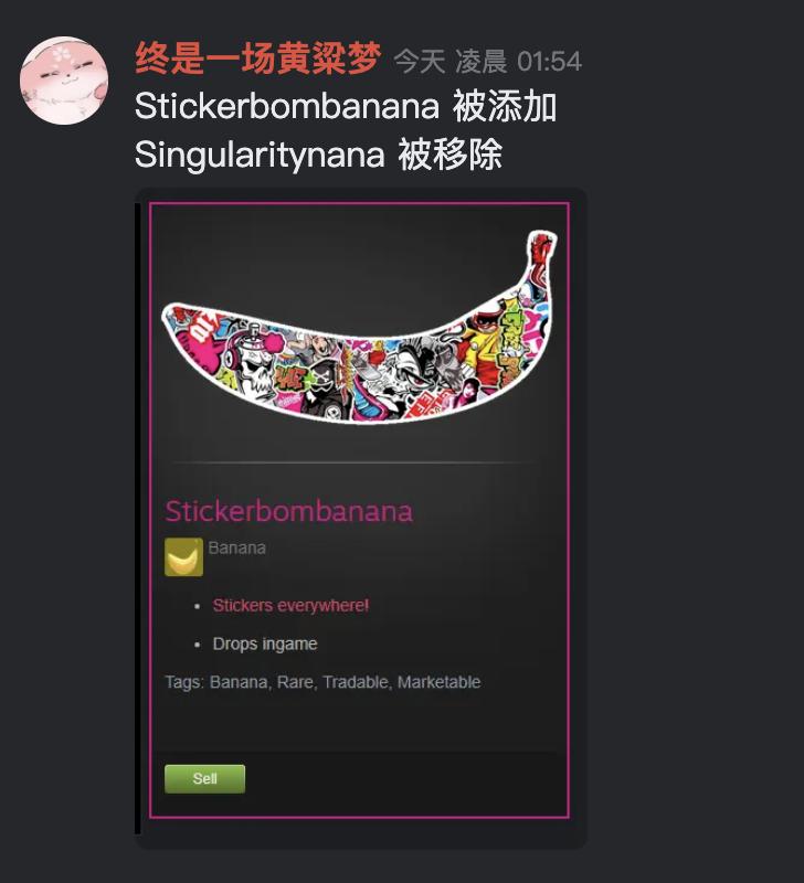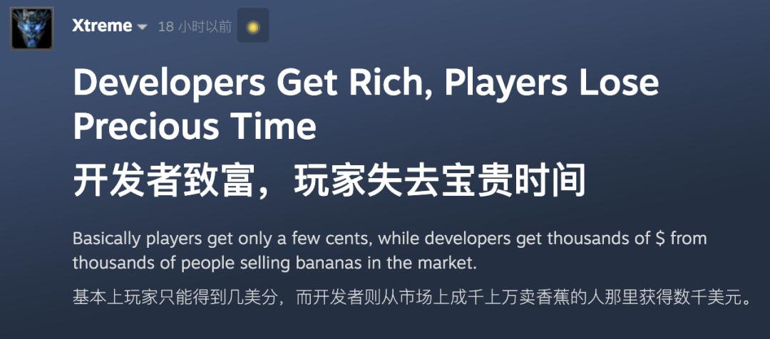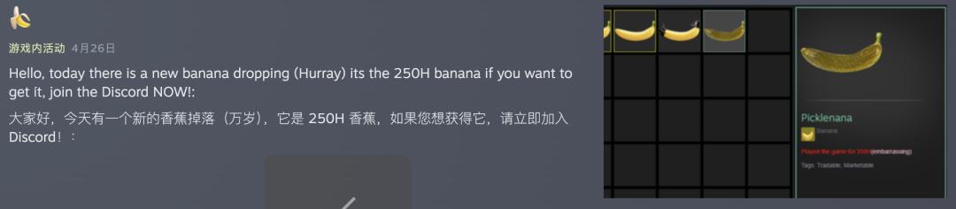 emmm ,像egg不是我說的,是遊戲開發者說的。他的話甚至比我更加直白:這就是個製作更糙的egg遊戲。《Banana》的開發團隊大概是來自德國,他們沒什麼公開資料歷史,此前,他們只開發過另外一款遊戲《Lass ich Sliden》,德譯中機翻過來是《讓我滑一下》。這個遊戲售價6元,質量奇差無比,感覺不如黑棉花悟能,遊戲裏就是一片山林草地組成的開放世界,玩家在裏面可以四處走動,其他的沒了。它目前只有40條玩家評論,不過由於遊戲內和《Banana》一樣也會掉落物品,所以整體評價也挺高,有90%。《Banana》最開始和《讓我滑一下》差不多,少有人問津。平時乾的也和《Egg》很像,無非是有事沒事過節送你個獨特香蕉。不過它和《Egg》有一點十分不同,那就是對市場更加關注,一切爲了市場交易服務。包括 “點擊遊戲”這個玩法,也被進行了優化,玩家每隔一段時間上線點點就行,不用一直在電腦後臺掛着遊戲了。另外,高價值香蕉會被有意的添加和淘汰,人爲製造稀缺性,給市場持續提供來自外界的刺激。當然,隨着玩家數量的增多,遊戲掉落的賽博香蕉數量,必然也會氾濫。不過官方先後以多種方式,對香蕉進行了回收,以進行調控。也正是因此,《Banana》慢慢火了起來,還開了中國玩家社區,擁有了比擺爛的《Egg》高得多的熱度。官方當然不是喫飽了撐得,花錢回收沒人買的賽博香蕉。根據美國商業雜誌福布斯於6月7日的報道, “每三個小時獲得香蕉,大部分香蕉價值3分錢,出售它們你可以獲得1分,V社和遊戲開發團隊各獲得1分 ”。注意,這是僅計算最廉價香蕉的買賣後得出的數字,還有不定數量的高價值香蕉的買賣沒有計算。也就是說,越多人玩這個遊戲,越多人在這裏達成交易,那遊戲開發團隊賺的就越多。所以官方回收香蕉的做法,其實就是把《Banana》產品壽命拉長的一種必要手段(相當於一些資本市場裏,“項目方”用回購、“燃燒”等方式控制通脹)。當你還在爲了幾分錢在Steam市場上掙扎的時候,遊戲開發團隊已經實現了很多人小時候的願望:每個人給我一分錢,我就變成了富翁。龐大的玩家數量和香蕉數量,足夠讓開發團隊大賺特賺。哪怕是最普通的香蕉,都還有兩百多萬個在Steam市場上掛着,這背後到底是多少錢,大家可以算算。