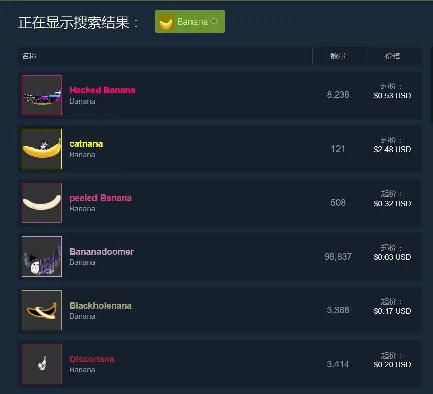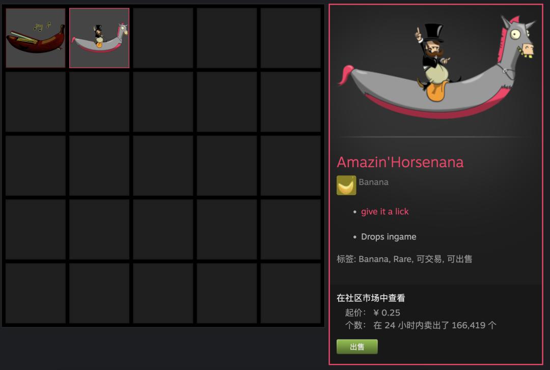 進入遊戲後,先是會彈出Unity引擎的提示,緊接着,在一片黃褐色的背景中,一根孤零零的香蕉,懸掛在屏幕中央。香蕉上方,還有一個數字0 。你要做的,就是動動小手,移動鼠標點擊香蕉。你每次點擊一次,香蕉上方的數字也會+1 。每過3小時,遊戲會掉落一根普通香蕉到你的Steam賬戶中;每過18個小時,遊戲還會掉稀有度更高的香蕉。也許不少老哥會一頭霧水,對《Banana》的走紅感到莫名其妙。但要是說,它是一款免費遊戲的同時,還能讓一部分人賺錢呢?你可能發現了,在上邊那張遊戲內截圖裏的左下角和右上角,還藏着兩個小按鈕。右上角那個按鈕是設置,但也只能設置一下分辨率,讓你選擇全屏或者窗口化,沒什麼好說的。重點是左下角那個不起眼的名爲shop的小按鈕,它藏了《Banana》爆火的祕訣。如果你的電腦安裝了加速器,可以成功進入Steam社區的話,那當你點擊這個按鈕,電腦就會自動彈出一個瀏覽器頁面,頁面中則是 banana 物品商店。而banana物品商店中交易的,就是遊戲裏每隔一段時間掉落到你賬戶裏的賽博香蕉。你說這香蕉有什麼價值嗎?它其實除了收藏大概什麼也幹不了。但當它可以流通的時候,一切就不一樣了。在Steam市場,不同品質的香蕉價格不同,重點是,它支持玩家間的交易,和現金掛鉤。